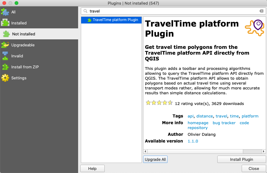 To start doing your own isochrone analysis in QGIS, you can find the TravelTime plugin by searching for ‘travel’ in the QGIS plugins window: