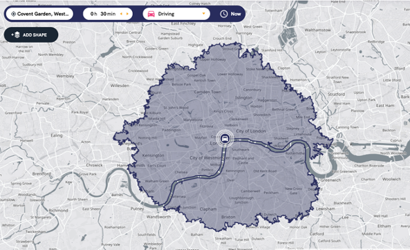 The example below shows where can be reached within 30 minutes’ drive from Covent Garden in London: