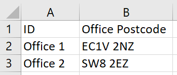 First we need the addresses for the two locations we want to create an isochrone around. We will then convert them into lat-long coordinates using the Geocoder macro so that they can be displayed on a map.