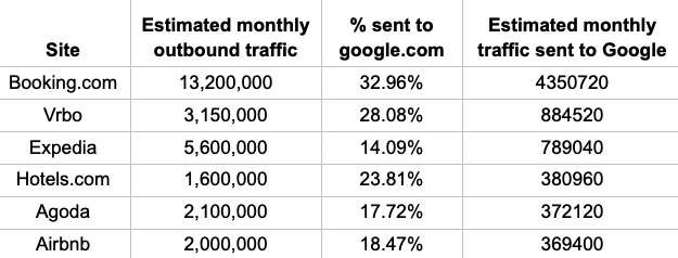 However, these sites continue to send significant traffic to Google. Every time they lose a user to Google, they’re back to square one and they have to spend more money on ads to entice that user back – it’s a vicious circle. The more traffic travel sites push to google, the higher their customer acquisition costs. Here’s a breakdown of which sites are leaking users to Google: